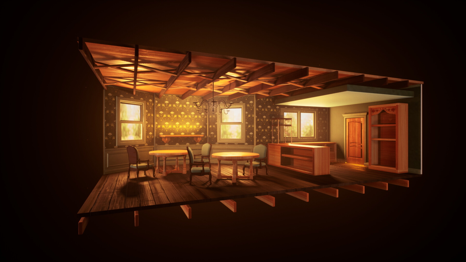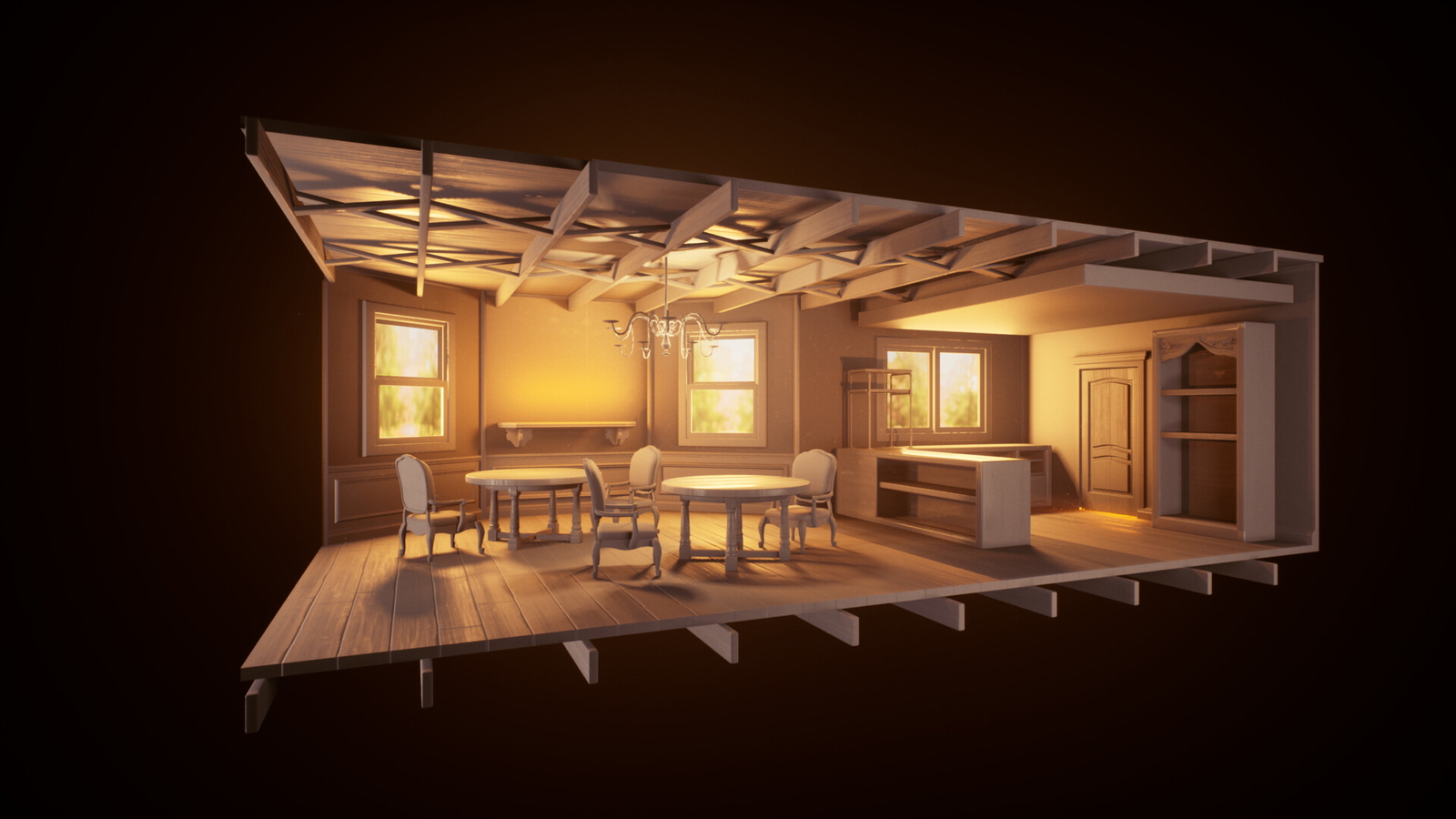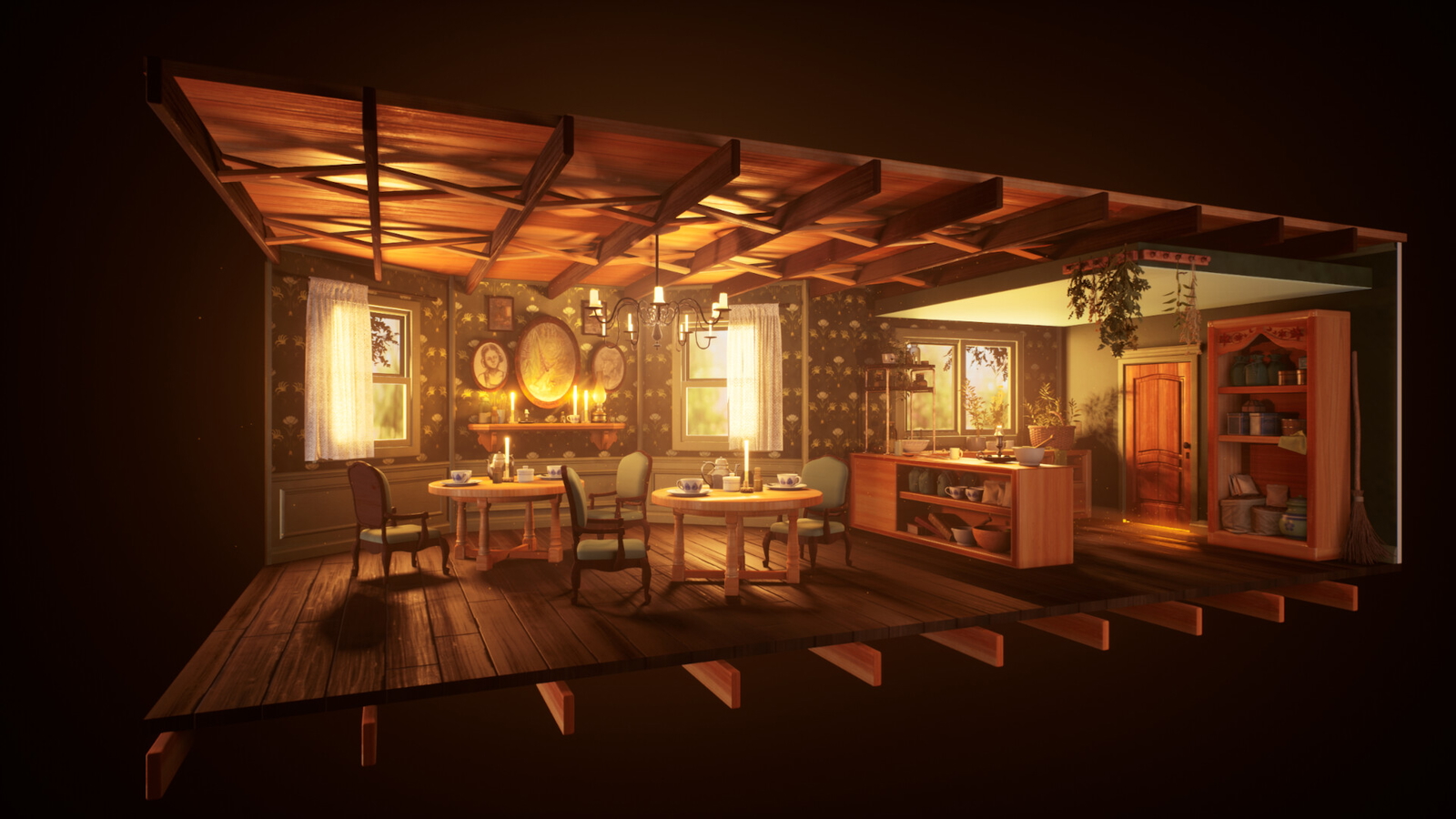 “In this project, I stepped out of my comfort zone a fair bit. I tried out parallax windows (ended up scrapping them unfortunately since they didn't look right, but still learned a lot), made dust particles in Niagara, explored the Movie Render Queue, did a lot of texture editing within Unreal Engine so I could quickly reuse materials, played around with the curve tool and quad draw (which I've used before but needed a refresher), and learned a ton about lighting. I also edited the texture found within the kitbashed picture frames to hold my own art pieces instead of the provided ones, which was fun since I had to add some filters to get it to match the antique look. I made as many modelled pieces as I could to be reusable, aiming for a semi-modular kit. This project took a while, but I'm proud of how it turned out. I hope you enjoy! Made by me using Maya, Substance Designer, Unreal Engine 5.4, and kitbashed props. Base layout and furniture modeled by me, small props such as tea cups & spoons found in Fab asset packs.”